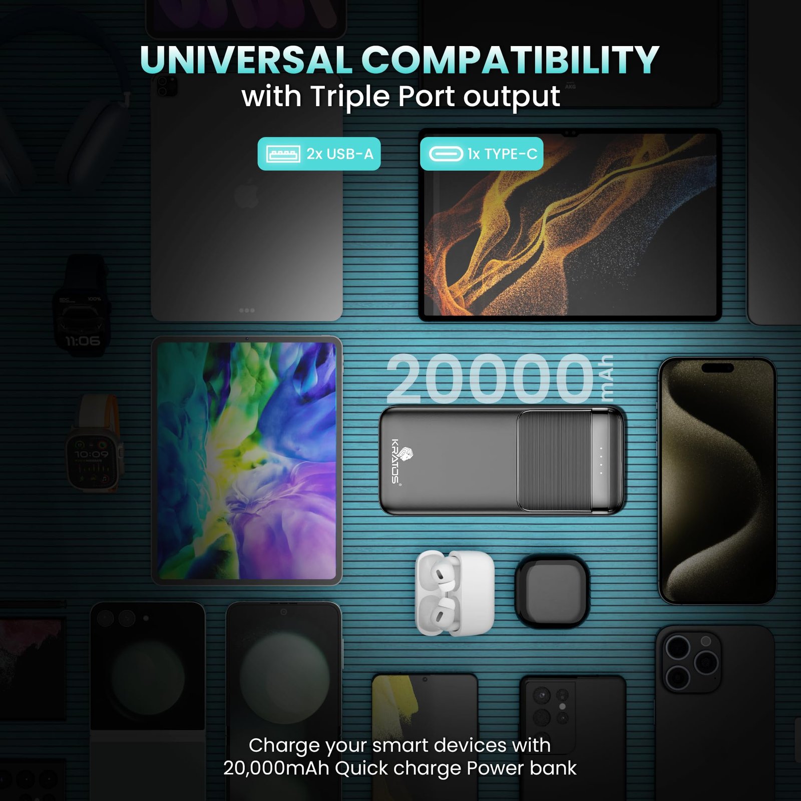 - Power Bank fast charging that Charge Multiple Devices Simultaneously – With 2 USB ports and One Type-C port for output, this powerbank can charge 3 devices at the same time.