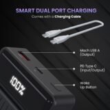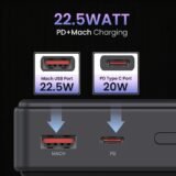 - Simultaneous Dual Powering: This sleek power bank features dual ports – a Mach USB-A (22.5W) and a Type-C PD 3.0 (20W), enabling you to charge two devices at once. Type C port also works for input to charge the power bank.