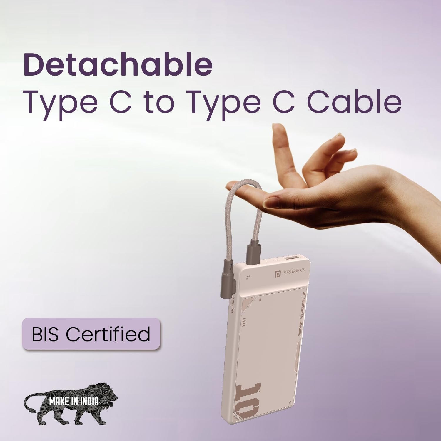 Details: Portronics Luxcell UNO 10 is a slim 10,000mAh power bank designed around convenience—the inbuilt detachable Type-C to Type-C cable pops out for instant charging and snaps back to keep your bag clutter-free, and it also acts as a handy carry loop. Delivering 22.5W fast charging, it can power up modern Android phones, Type-C iPhones (with C-to-C), earbuds, tablets and more. With dual output, you can charge two devices at once using the integrated Type-C cable plus the USB-A port, while the bidirectional Type-C PD port on top lets you both recharge the power bank quickly and top up devices when needed. A compact, pocketable build with LED battery indicators makes it travel-friendly, and multi-protect safety defends against over-current, over-voltage, short-circuit and heat. Important note: the Type-C slot on the side is a dummy docking bay only for parking the built-in cable—it does not support charging or data. For charging, use the top Type-C PD port, USB-A port, or the included cable.