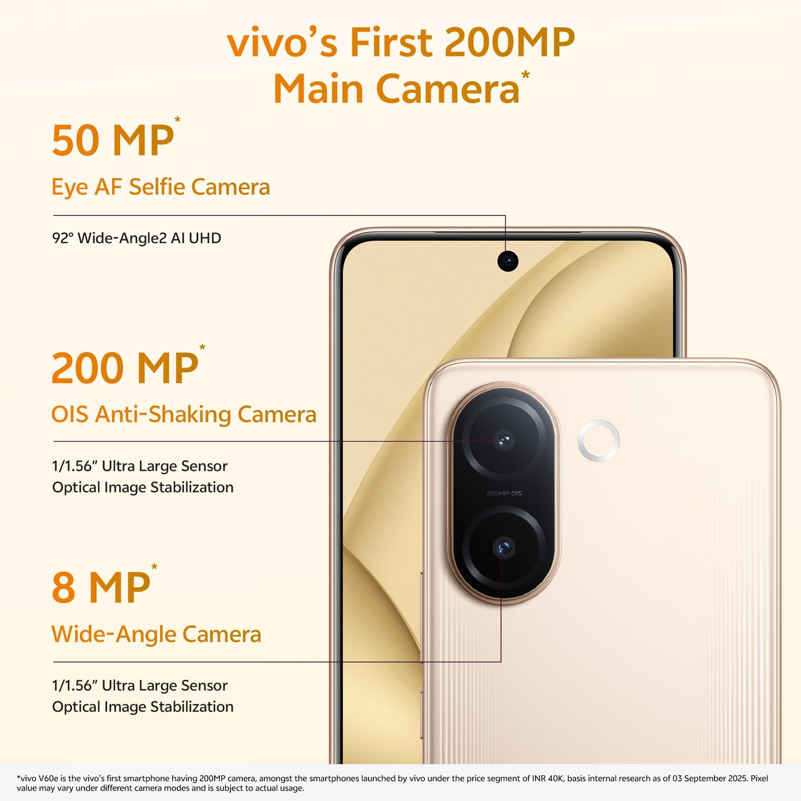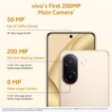 - [CAMERA]: Rear Camera: 200 MP Ultra-Clear Main Camera: OIS, f/1.88, FOV 84°, 6P lens 8 MP Wide-Angle Camera: f/2.2, FOV 120°, 5P lens | Rear f/1.88 (200 MP Ultra-Clear Main Camera) | f/2.2 (8 MP Wide-Angle Camera) | Selfie Camera: 50 MP Eye AF Group Selfie Camera: AF, f/2.0, FOV 92°, 5P lens | Front f/2.0 (50 MP Eye AF Group Selfie Camera)